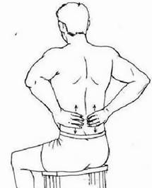 晚上没事的时候,可以端坐在凳子上,两脚分开,大约与肩同宽就可以了。将两手掌对搓数十次,待发热后,紧按两侧腰眼处。稍停几秒钟,然后两手掌顺着腰椎两旁,上下用力搓动——向下搓到尾骨下的长强穴(尾骨尖与肛门之间)处,向上搓到两臂后肘尽处。连续36次。